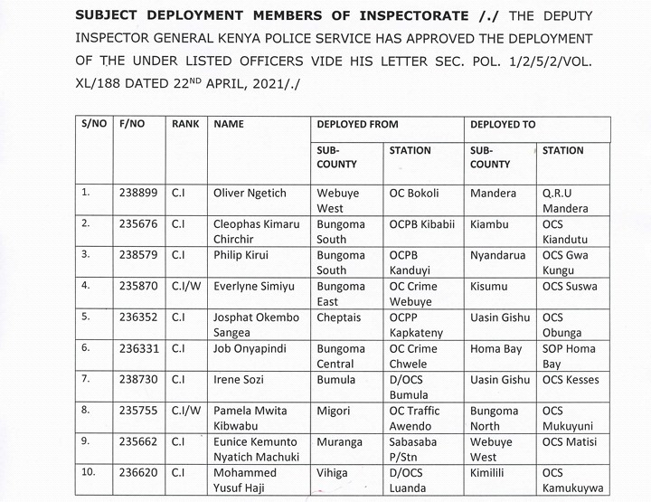 Others include the head of the Border Patrol Unit College in Kanyonyo, Abdulahi Aden, Railways Police Commandant Peter Ndung’u, head of logistics at Administration Police, and former spokesman Masood Mwinyi and director of personnel at Kenya Police headquarters Boniface Maingi.